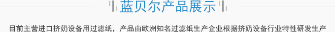 濟南藍貝爾工貿有限公司主要產品擠奶設備過濾紙,牛奶過濾紙,擠奶機過濾袋,目前主營進口擠奶設備用過濾紙,產品由歐洲知名過濾紙生產企業(yè)根據擠奶設備行業(yè)特性研發(fā)生產,產品符合歐盟食品接觸標準及FDA食品接觸標準,產品在擠奶設備過濾紙行業(yè)占有70%以上的份額。并通過了SGS標準技術檢測中心按國標食品級標準進行的檢測。產品適用于各種擠奶設備品牌,本公司目前獲得該區(qū)域產品營銷資格。產品已用于國內各大乳企所屬牧...